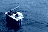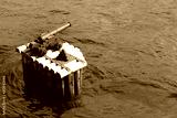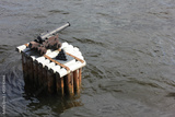 Cannon Gun Model with Cannon Balls on Water. Old Medieval Cannon Gun Isolated on Small Platform in River Water. Historical Fortress Protection Installation. War, Battle, Military Attack Concept.