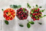 Different cherry on plate on white background, ripe cherries, sweet fruit, top view