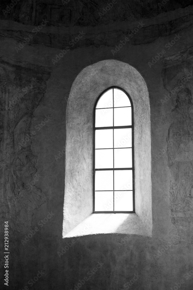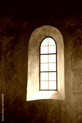 Ancient thick walled monastery / church window niche with wooden bench and diffuse indirect light.