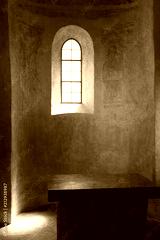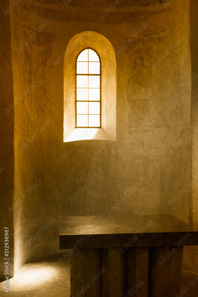 Ancient thick walled monastery / church window niche with wooden bench and diffuse indirect light.