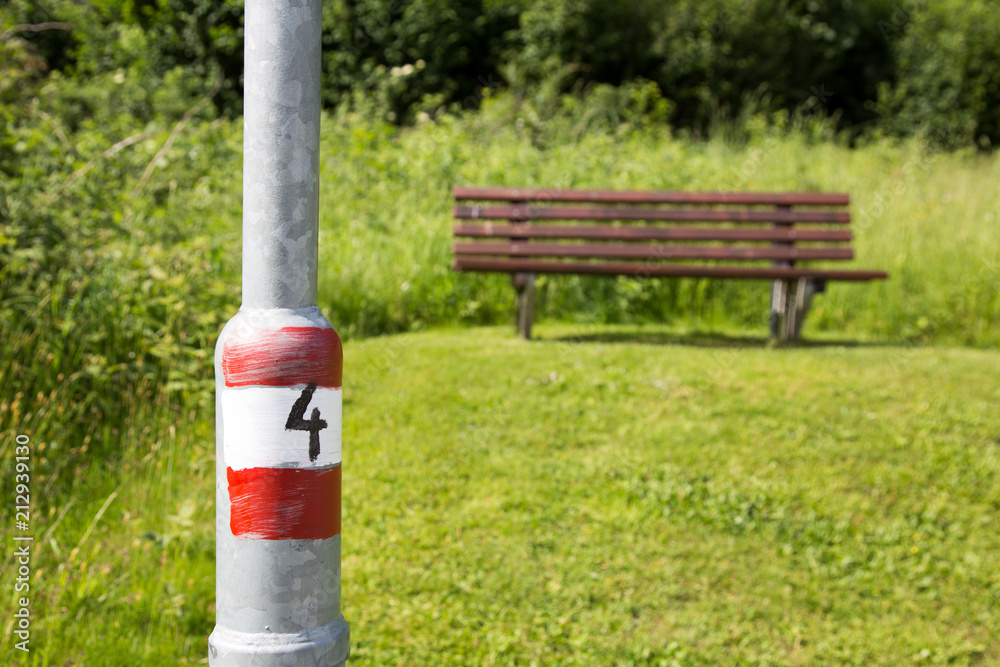 Red and white numbered; 4 Alpine hiking trail mark on a lamp post with bench in the background.