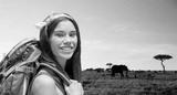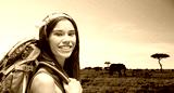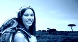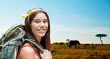 adventure, travel, tourism, hike and people concept - smiling young woman with backpack over animals in african savannah background