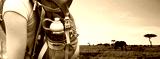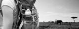 travel, tourism, hike and people concept - close up of woman with water bottle in backpack pocket over animals in african savannah background