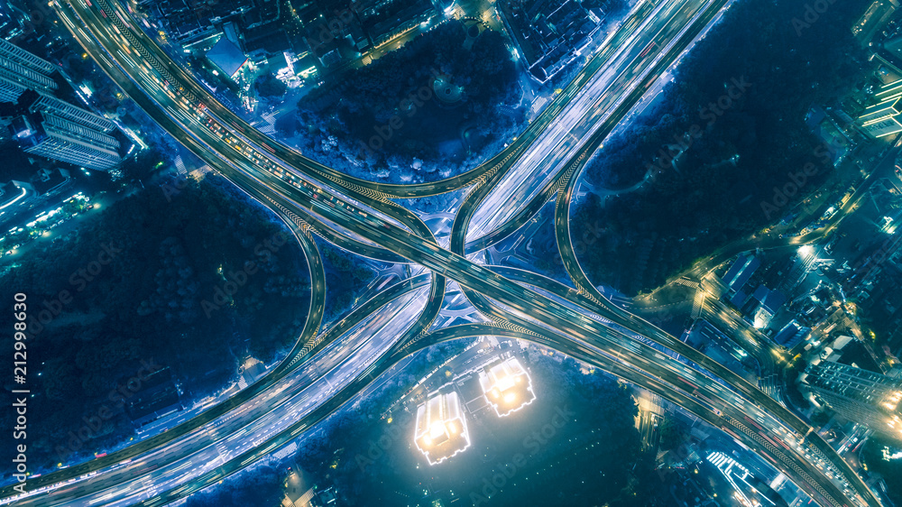 aerial view of highway interchange at night