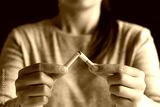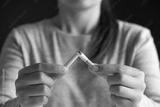 World No Tobacco Day, May 31. STOP Smoking. Close up woman hand breaking, crushing or destroying cigarettes on black background.