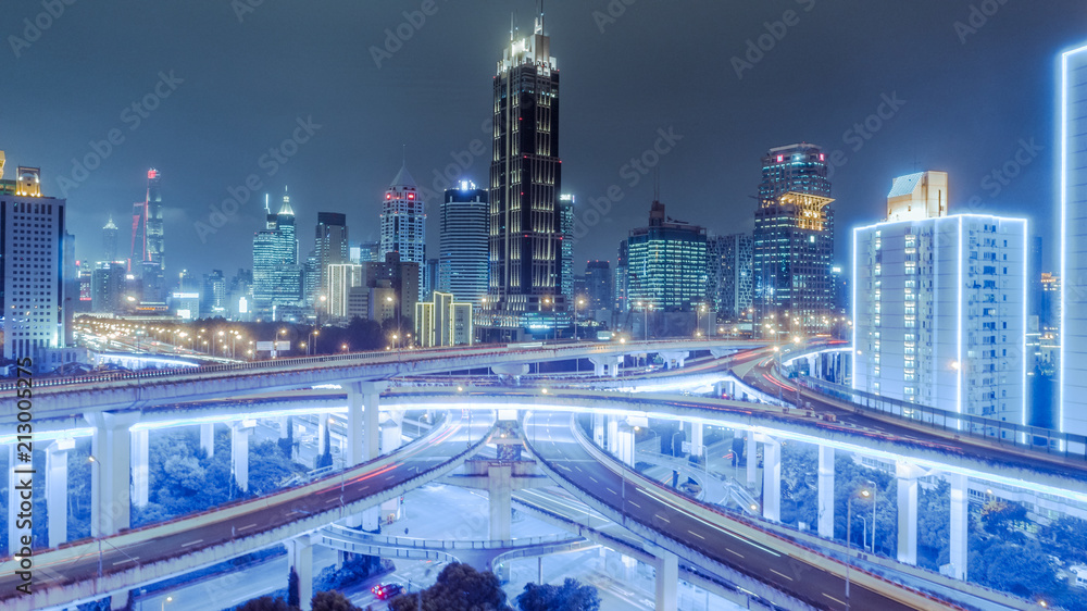 aerial view of buildings and highway interchange at night in Shanghai city