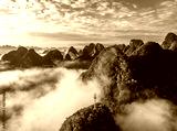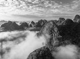 aerial view of cloudscape above village, farmland and roll of hills in morning