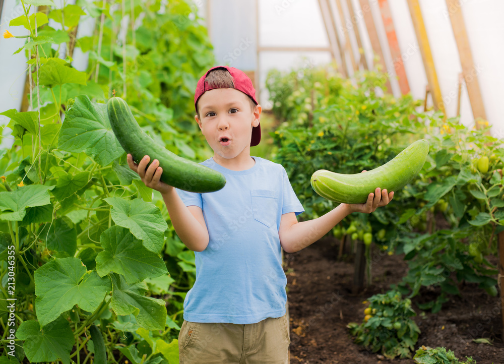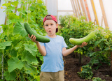 A child in amazement holding a large giant cucumbers in the greenhouse. Agriculture and healthy food. Have a big harvest in my garden