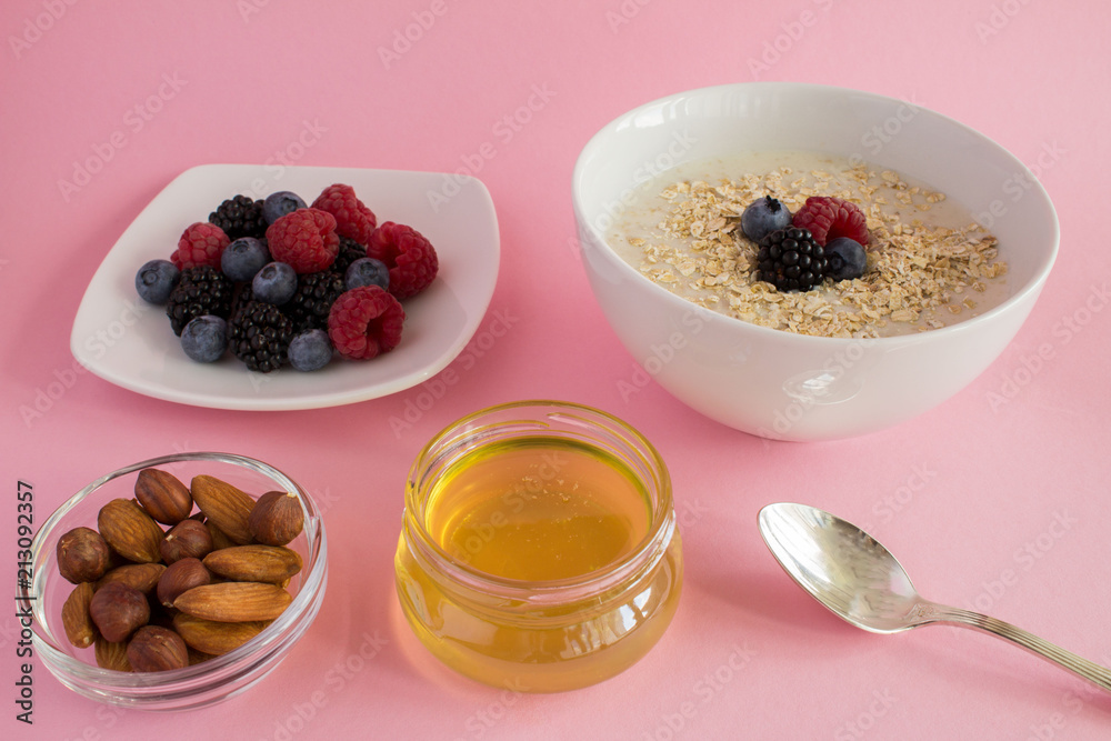 Breakfast: oatmeal with berries,honey and nuts on the pink background