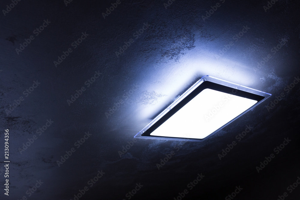 Luminous square-shaped lamp on the ceiling in cold blue