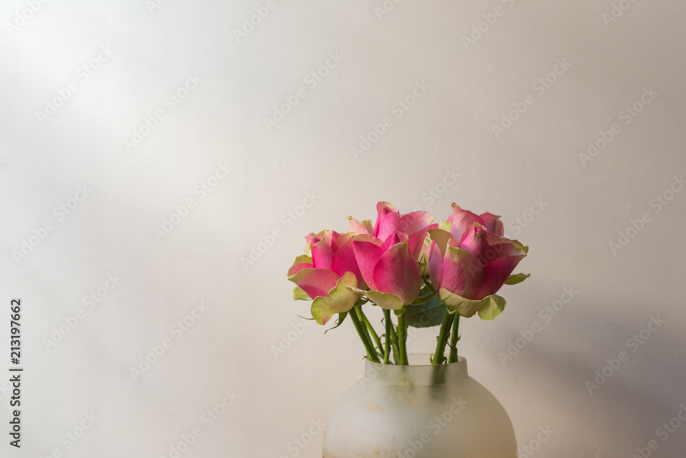 Close up of pink variegated roses in glass vase against beige wall with soft shadows (selective focus)