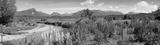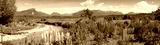 Panoramic view of a small river and mountain range approaching the fiordland area of New Zealand. Focus is on the mid range purple Foxglove plants.