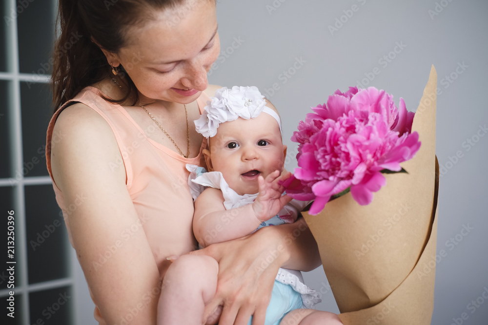 Happy young family. Mother and baby with flowers