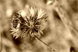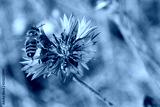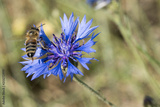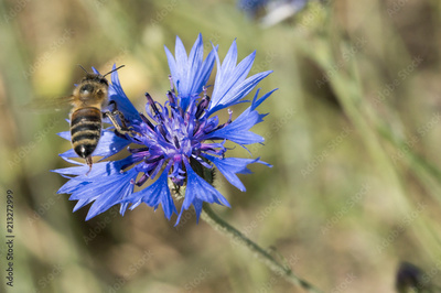 Bee pollinating blue cornflower in the spring on the field