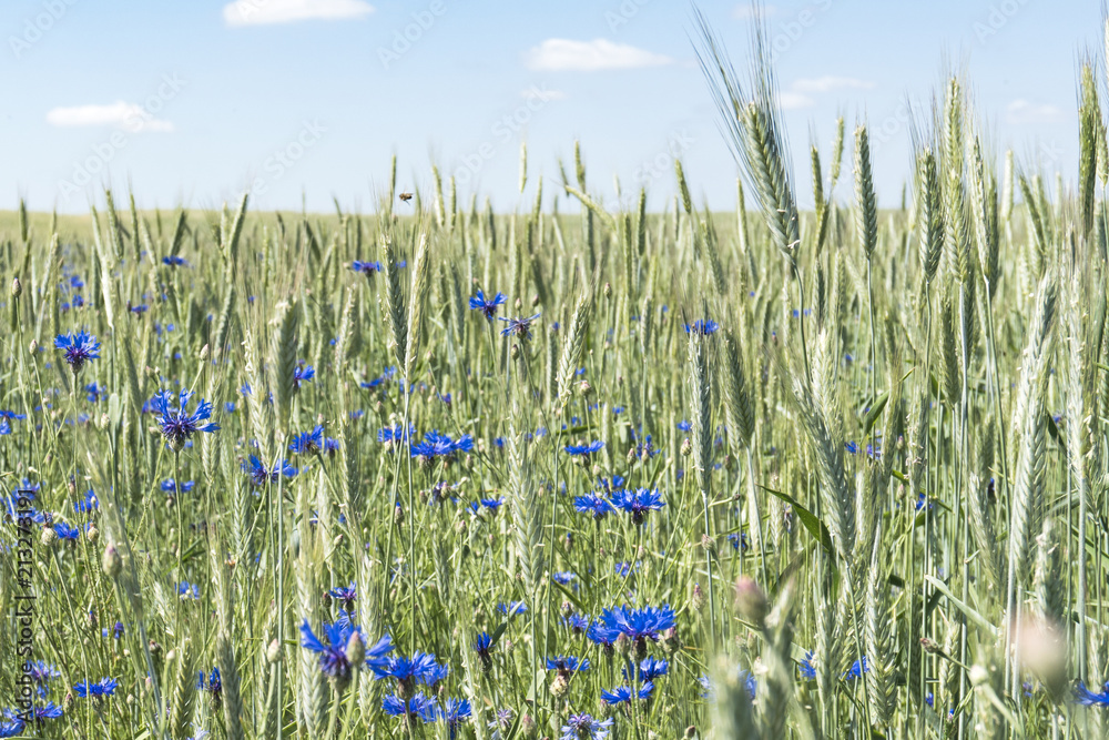 wild cornflowers in a wheat field on a sunny day