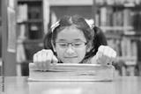 School education and literacy concept with Asian girl kid student learning and reading book in library or classroom