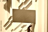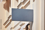 Small simple sign of boutiques on the city facade to promote the design of the logo