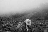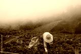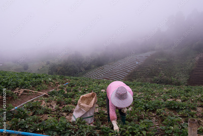 a farmer woman was harvesting strawberries on the mountain in the morning mist at Phu Tub Berk in Thailand,