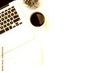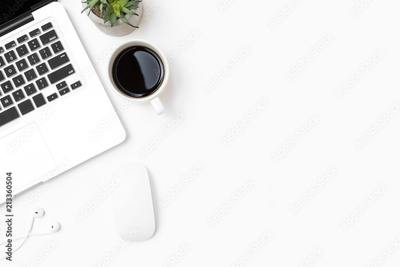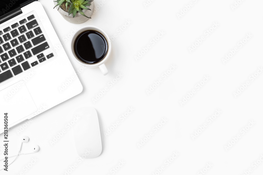 White office desk table with laptop computer, cup of coffee and office supplies. Top view with copy space, flat lay.