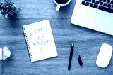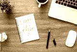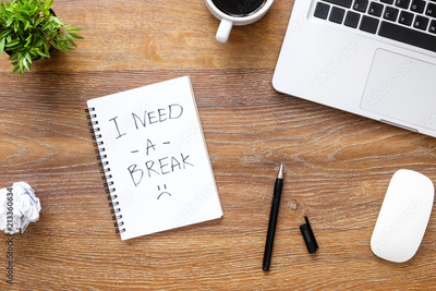 Notebook with text "I need a break" is on top of wood office desk table. Top view, flat lay.
