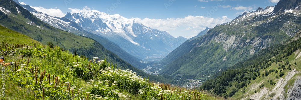 a view of the chamonix valley from the alpine mountains in the Vallorcine area with foreground of alpine meadows on a clear summer day with blue sky and bright clouds