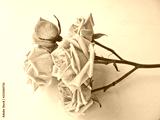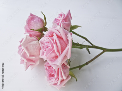 Branch of pink roses on a white background. Buds of pink roses. Macro. Side view