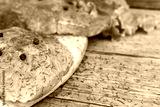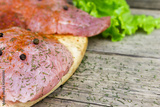 Raw meat with spices and fresh salad leaves on an old vintage wooden background