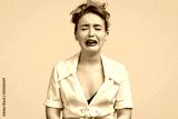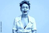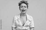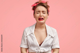 Depressed European female in low spirit, cries desperately, has red lips closes eyes, has grief, wears white top and headband, stands against pink wall. Lonely stressful woman in retro style