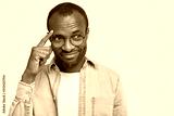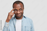 Thoughtful pleased dark skinned middle aged male keeps index finger on temples, tries to concentrate on something, dressed in denim shirt, isolated over white background. Pensive man indoor.
