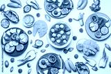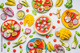 Flat lay of summer various colorful sliced tropical fruits and berries in plates and bowls on white background, top view. Clean and healthy lifestyle background