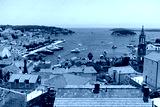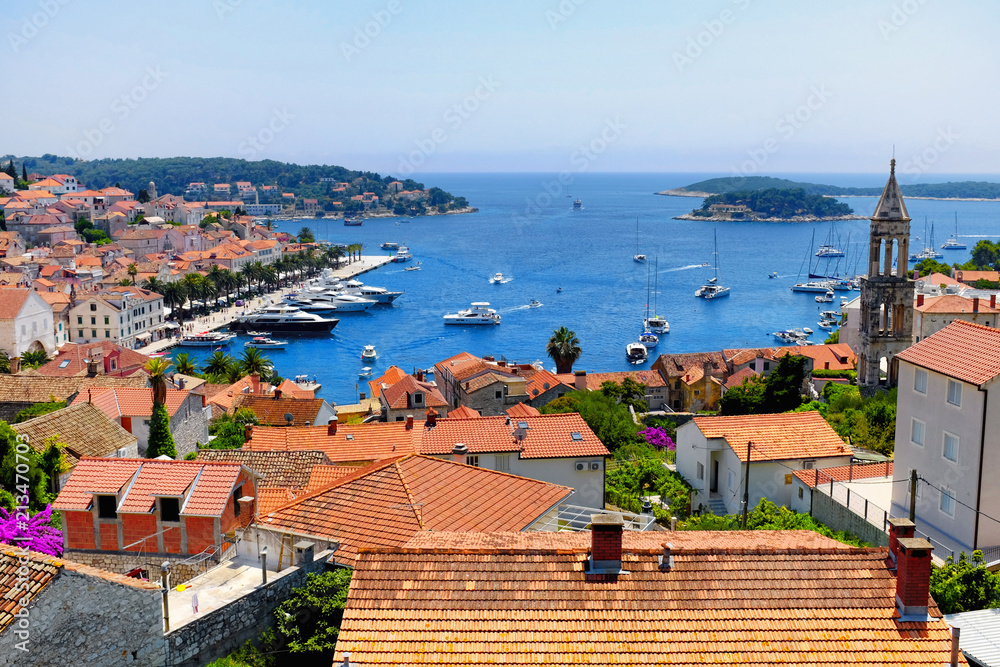 View of Hvar town harbor with lots of red roofs in Croatia