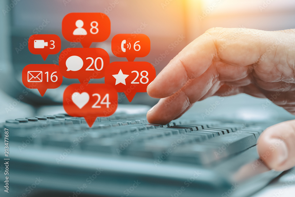 man typing and notification icons of social network flying over keyboard