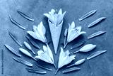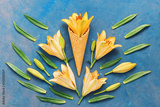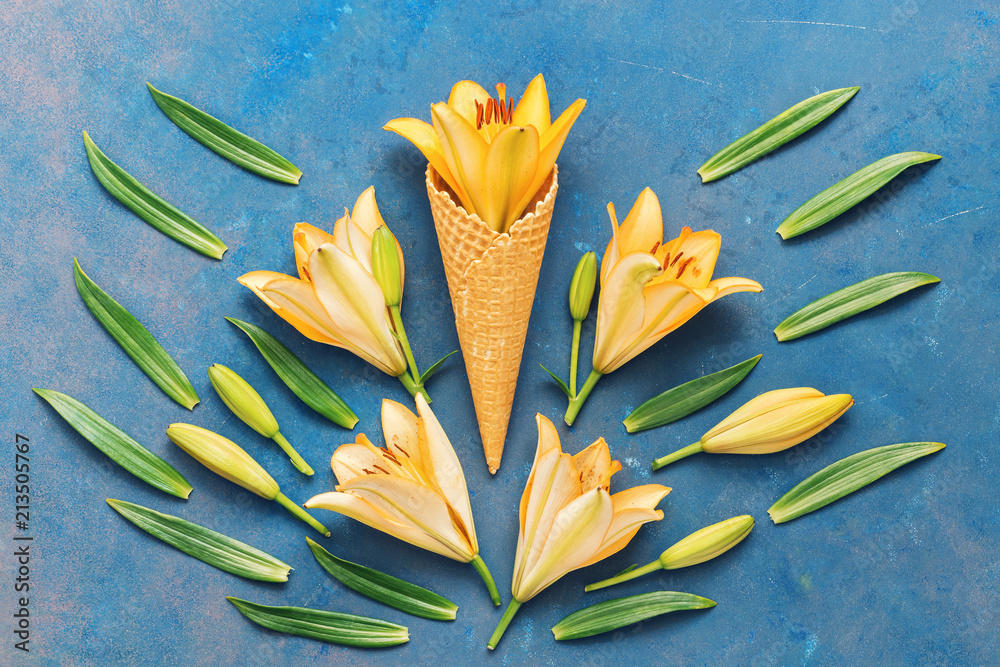 Composition of lily heads and waffle cone on a blue background. beautiful composition of flowers. View from above, flat lay