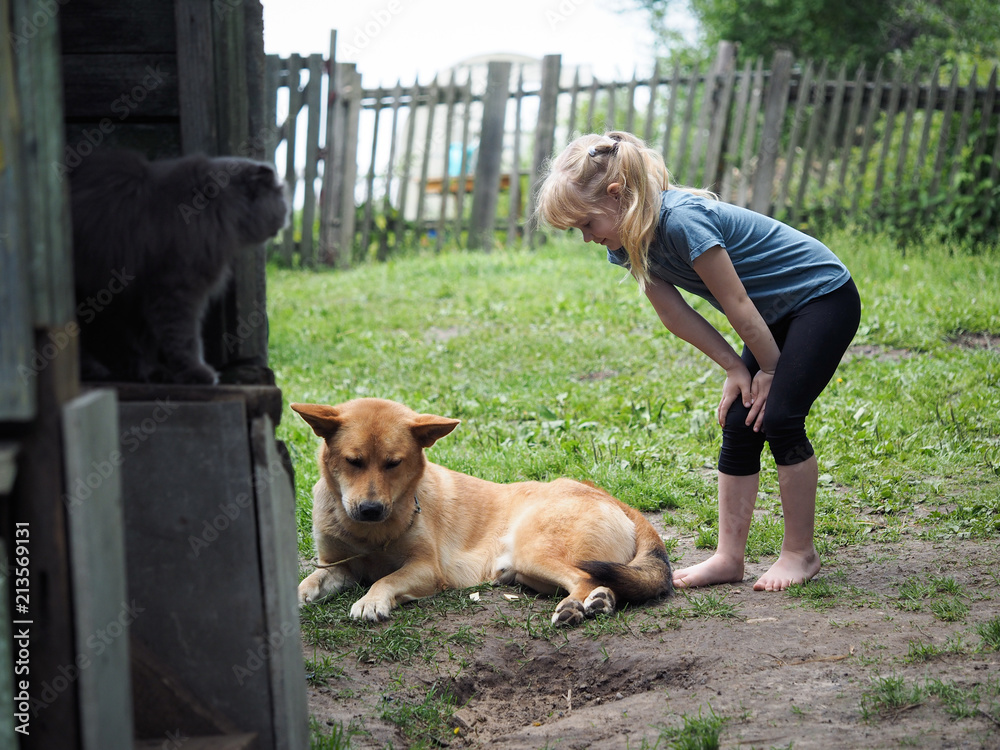 A little girl communicates with a big and sad dog.
