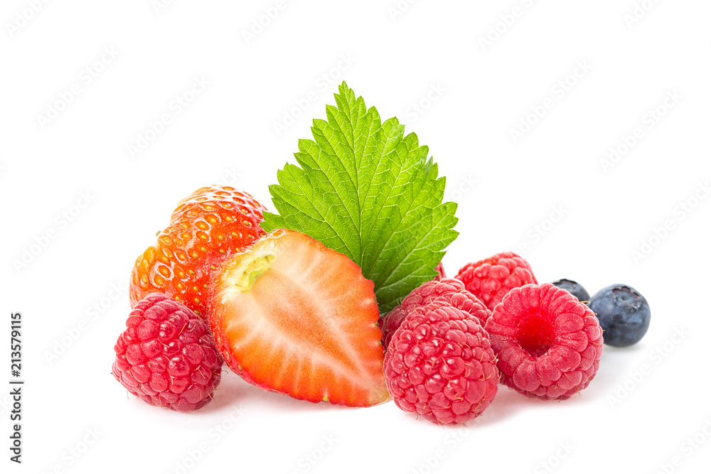 Healthy food berries group. Macro shot of fresh raspberries, blueberries and strawberry with leaf isolated on white background.