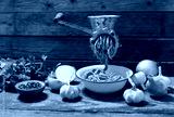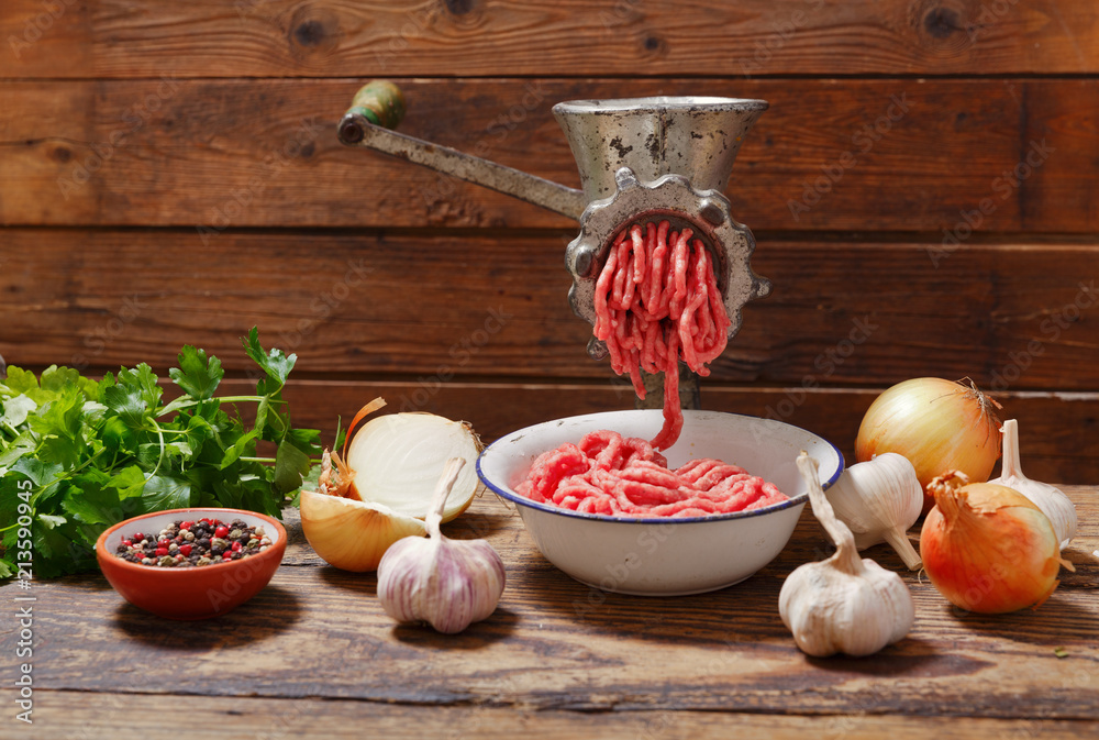 old meat grinder with minced meat and vegetables