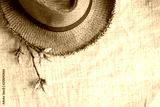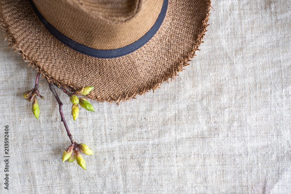 Top view of Summer brown panama straw hat with flower plant on linen cloth.travel concept.copy space for adding text.