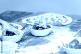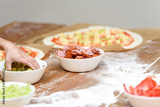 Close-up of children's hands preparing pizza. Children lay out on the basis of pizza vegetables and cheese
