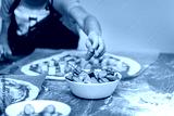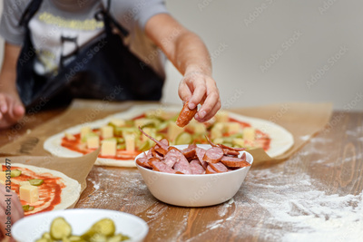 Close-up of children's hands preparing pizza. Children lay out on the basis of pizza vegetables and cheese