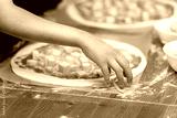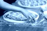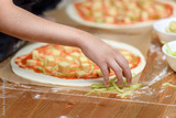 Close-up of children's hands preparing pizza. Children lay out on the basis of pizza vegetables and cheese