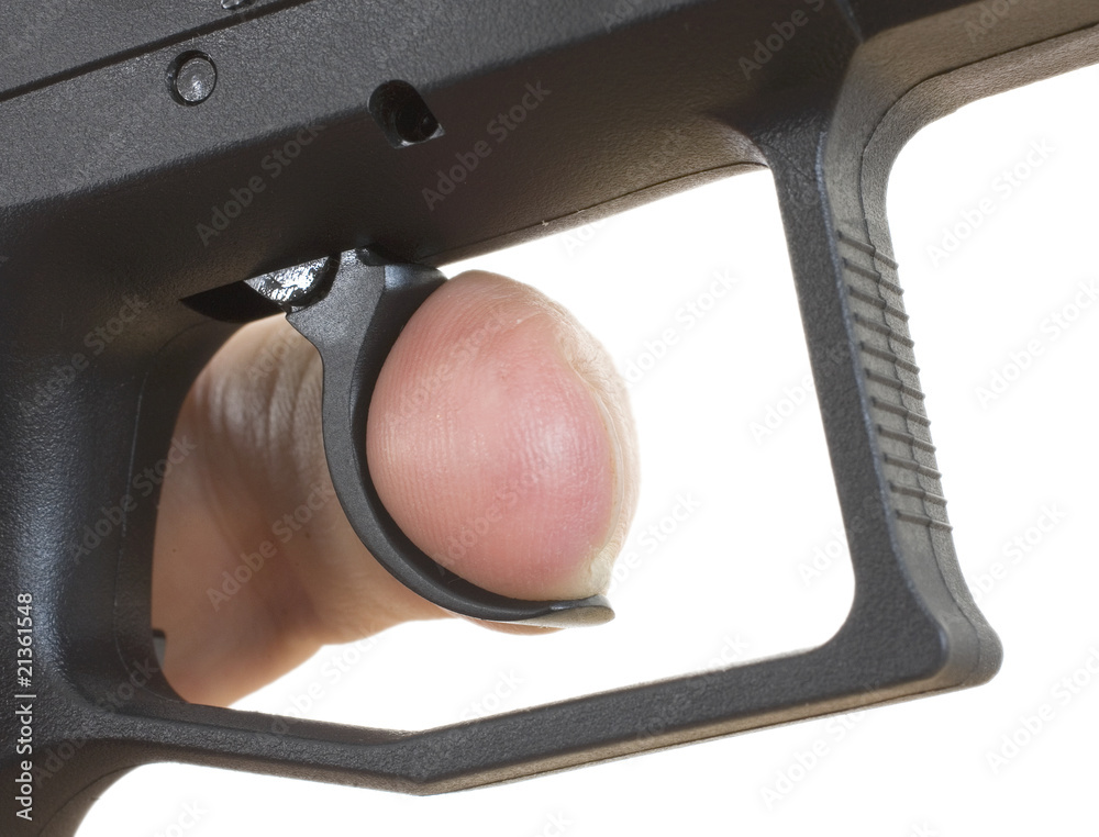 ready to shoot with a finger on the trigger of a semi-auto pistol isolated on a white background.