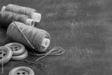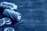 Set of multicolored threads on reels, large needle for sewing, buttons and pins .