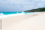 The beach on the Seychelles with white sand turquoise water and blue sky