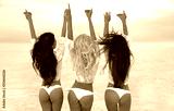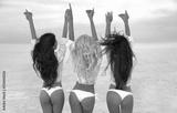 Girlfriend. Happy three female friends in sexy bikini having fun on white beach at sunset. Group of slim ladies cheering with glass of aperol spritz cocktail. Women Enjoying life with drinks.