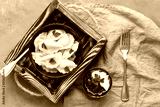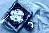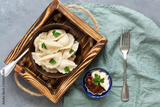Ravioli with sauce wooden box. Gray background, flat lay.