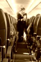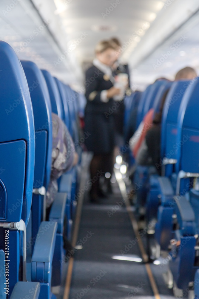The defocused stewardess serve refreshments on board the aircraft. An view at the corridor of the airplane.