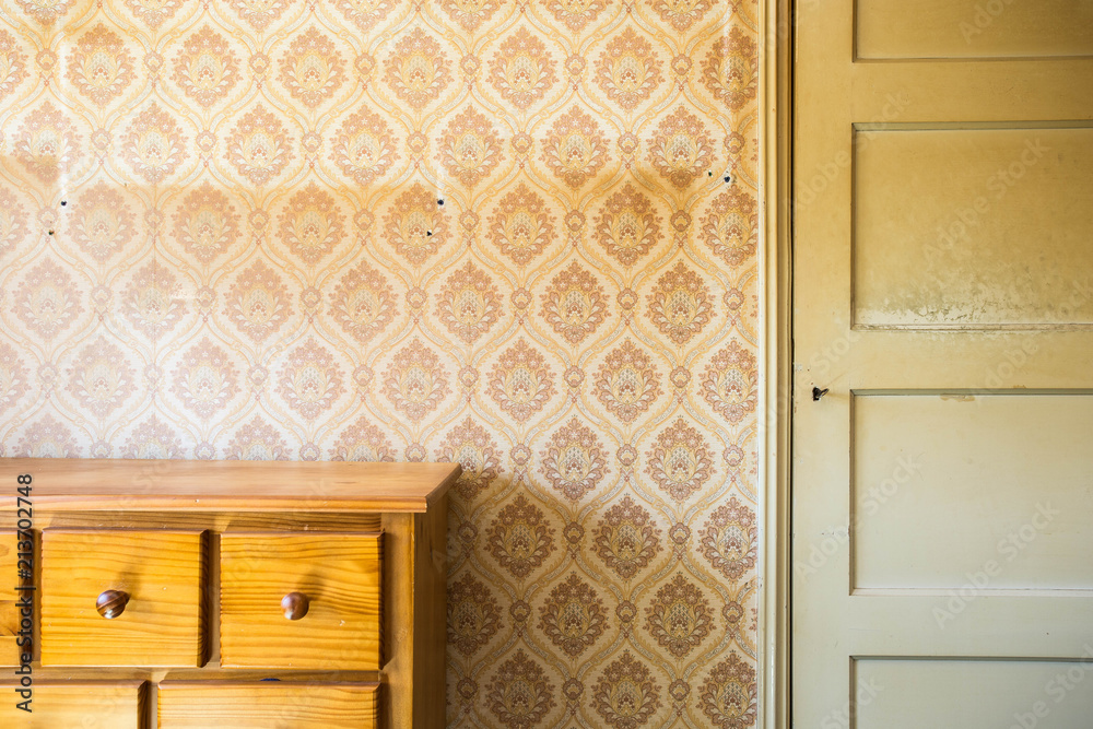 Vintage room with pattern wallpaper and old fashioned closet and door. Rustic interior design.