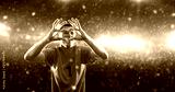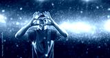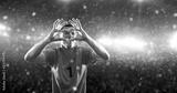 Soccer player celebrates a victory on the professional stadium while it’s snowing.