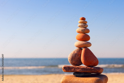 Rock zen pyramid of white and pink pebbles on a background of blue sky and sea.