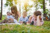 Young family with two young children on a summer picnic in the park on a beautiful sunny day